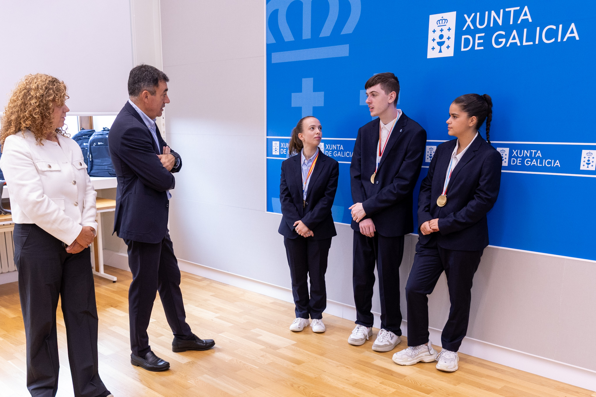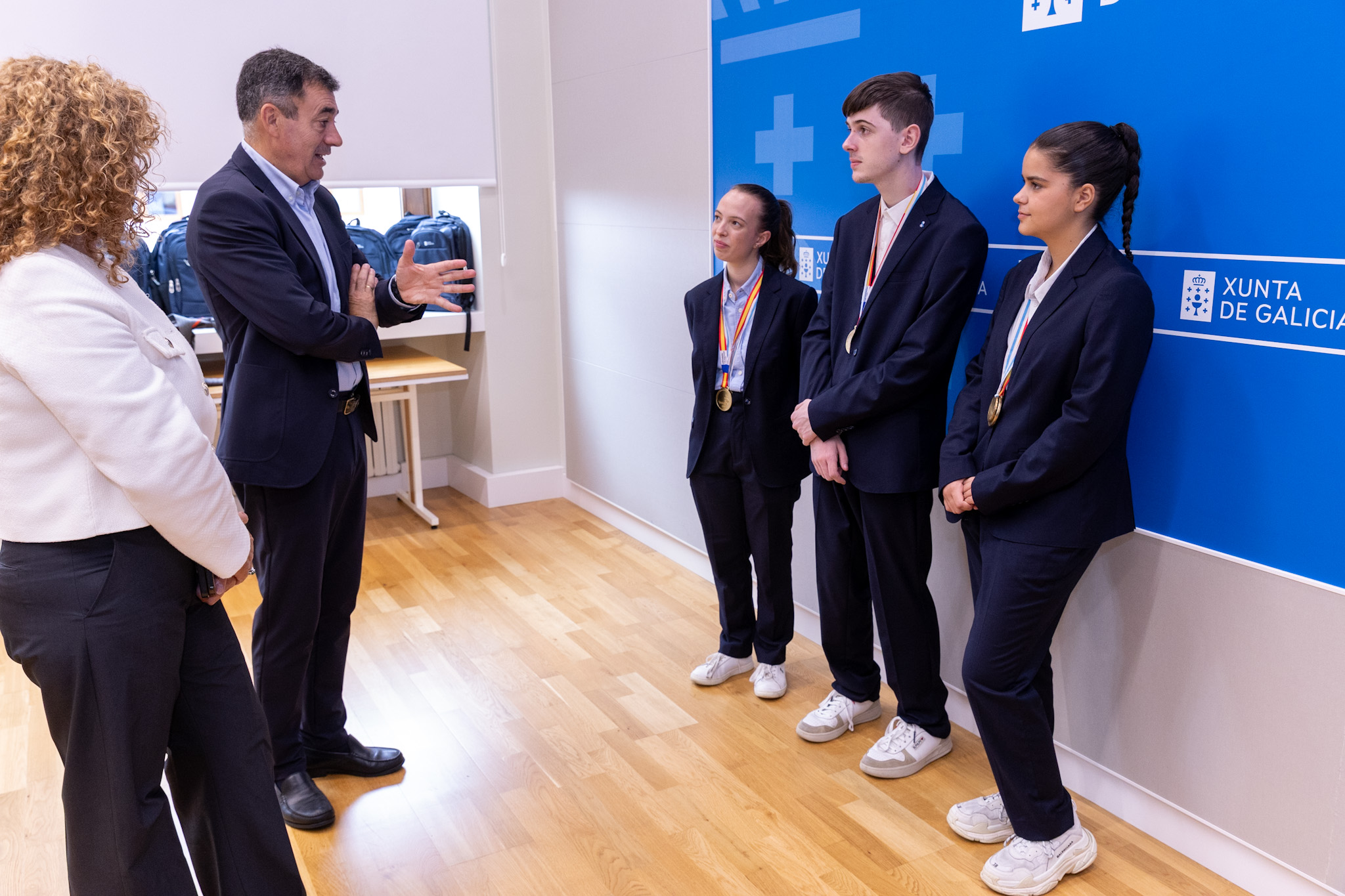 O conselleiro de Educación recibe os mozos que representarán a nosa Comunidade en Dinamarca: Laura Pereira, do CIFP Manuel Antonio de Vigo; María Bazar, do CIFP Paseo das Pontes da Coruña, e Ezequiel Soto, do IES San Clemente de Santiago