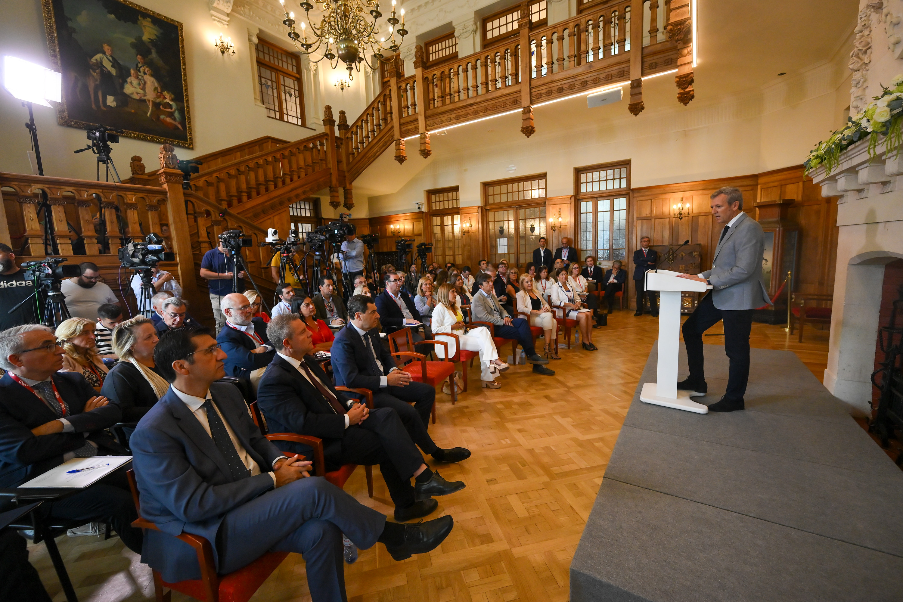 El titular del Gobierno gallego puso como ejemplo de éxito la Eurorregión Galicia-Norte de Portugal, que pasó de ser una frontera a convertirse en un espacio de cooperación consolidado en ámbitos como la innovación, la inversión o proyectos estratégicos compartidos, demostrado durante la reciente ola de fuegos que afectó especialmente a la provincia de Ourense.