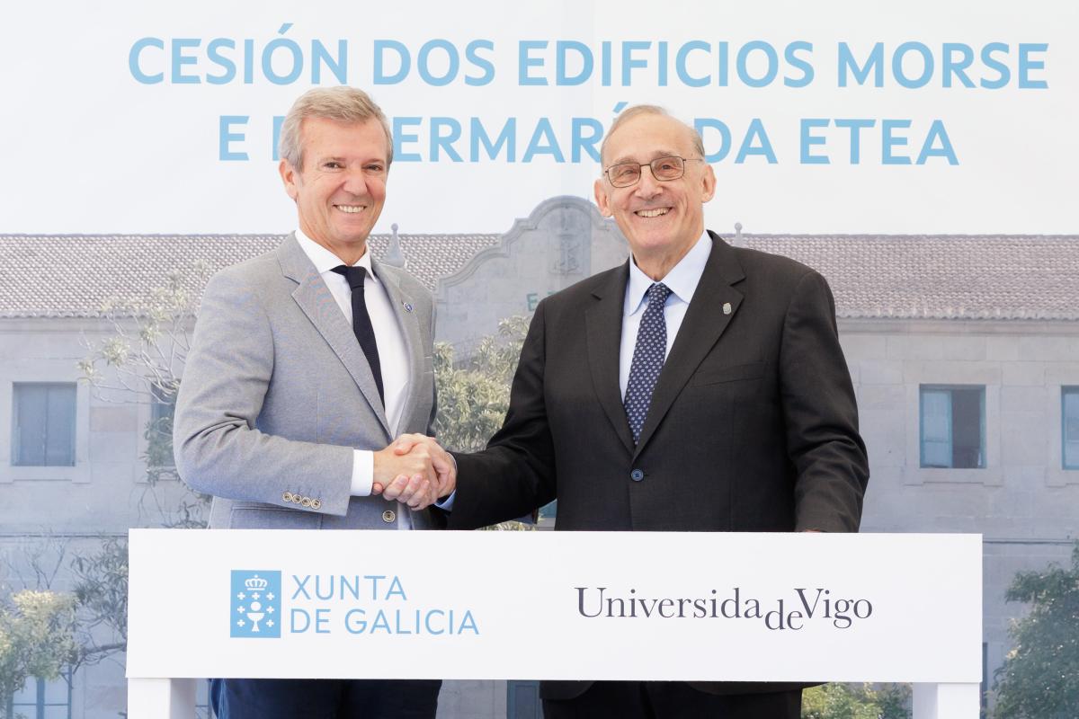 El presidente de la Xunta de Galicia, Alfonso Rueda, acompañado del conselleiro de Hacienda y Administración Pública, Miguel Corgos, participó hoy en el acto de firma del convenio entre la Administración autonómica y la Universidad de Vigo que permitirá la rehabilitación y cesión de los dos edificios de la antigua ETEA por un período máximo de 75 años. Subrayó que este acuerdo refuerza la vinculación de la universidad con la ciudad y con la sociedad gallega, al transformar inmuebles de alto valor simbólico en nuevos espacios al servicio de la docencia, la investigación, la creación cultural y el conjunto de la ciudadanía: "De todos los usos posibles, creo sinceramente que este es el mejor. Estoy contento de ponerlo en las mejores manos y en el mejor destino y comprometo también el apoyo de la Xunta de Galicia", apuntó el presidente.