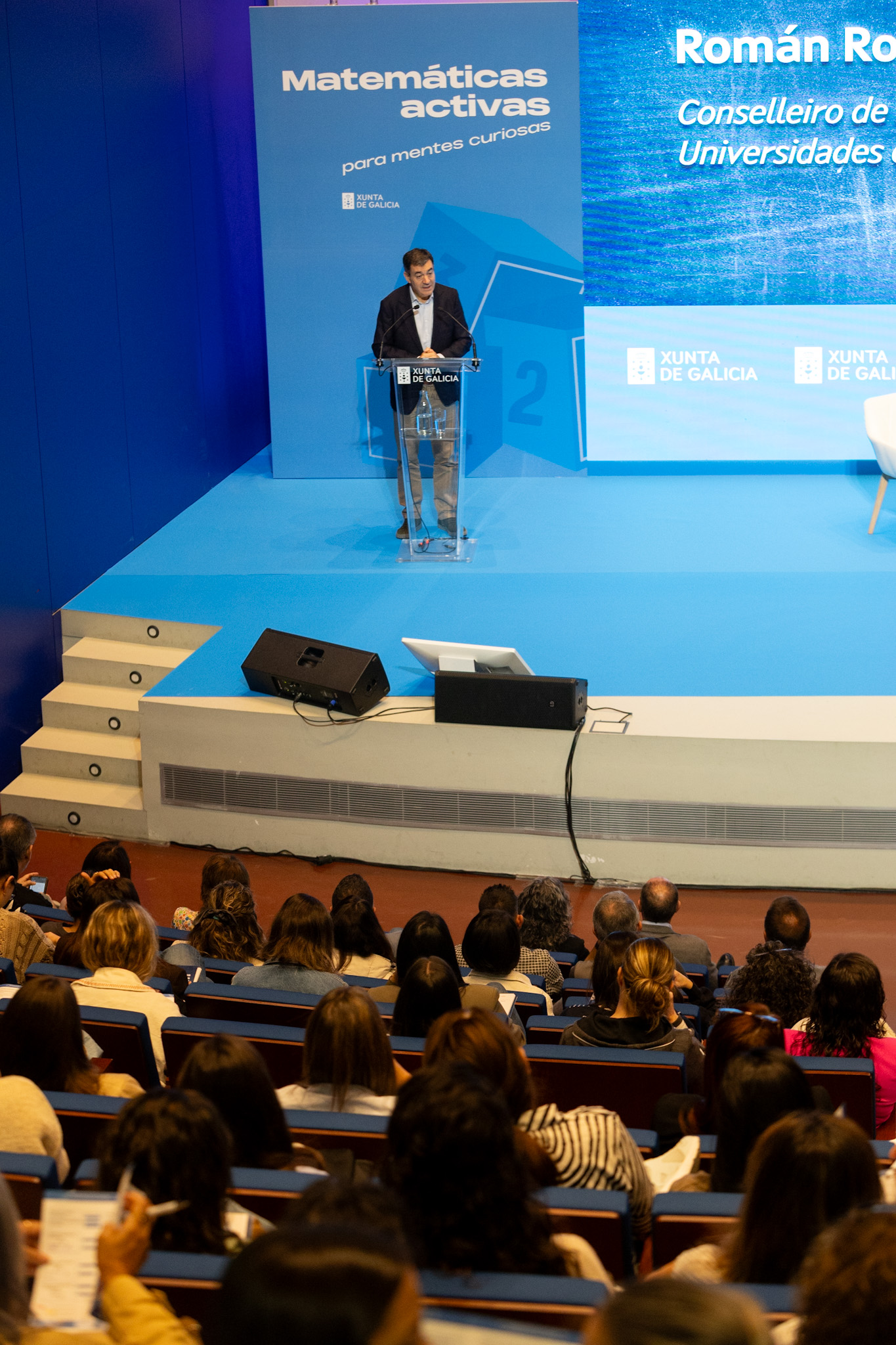O conselleiro de Educación, Ciencia, Universidades e FP, Román Rodríguez, acompañado polo director xeral de Centros e Recursos Humanos, Jesús Álvarez, inaugurou hoxe a xornada de formación para o profesorado Matemáticas activas para mentes curiosas. Este encontro forma parte do Plan anual de formación do profesorado, que este ano medra nun 10% con fincapé no reforzo, entre outras áreas, das matemáticas. “Estas competencias son unha das prioridades deste curso, co obxectivo posto en achegar esta disciplina ao alumnado a través dun enfoque práctico”, sinalou o representante da Xunta.