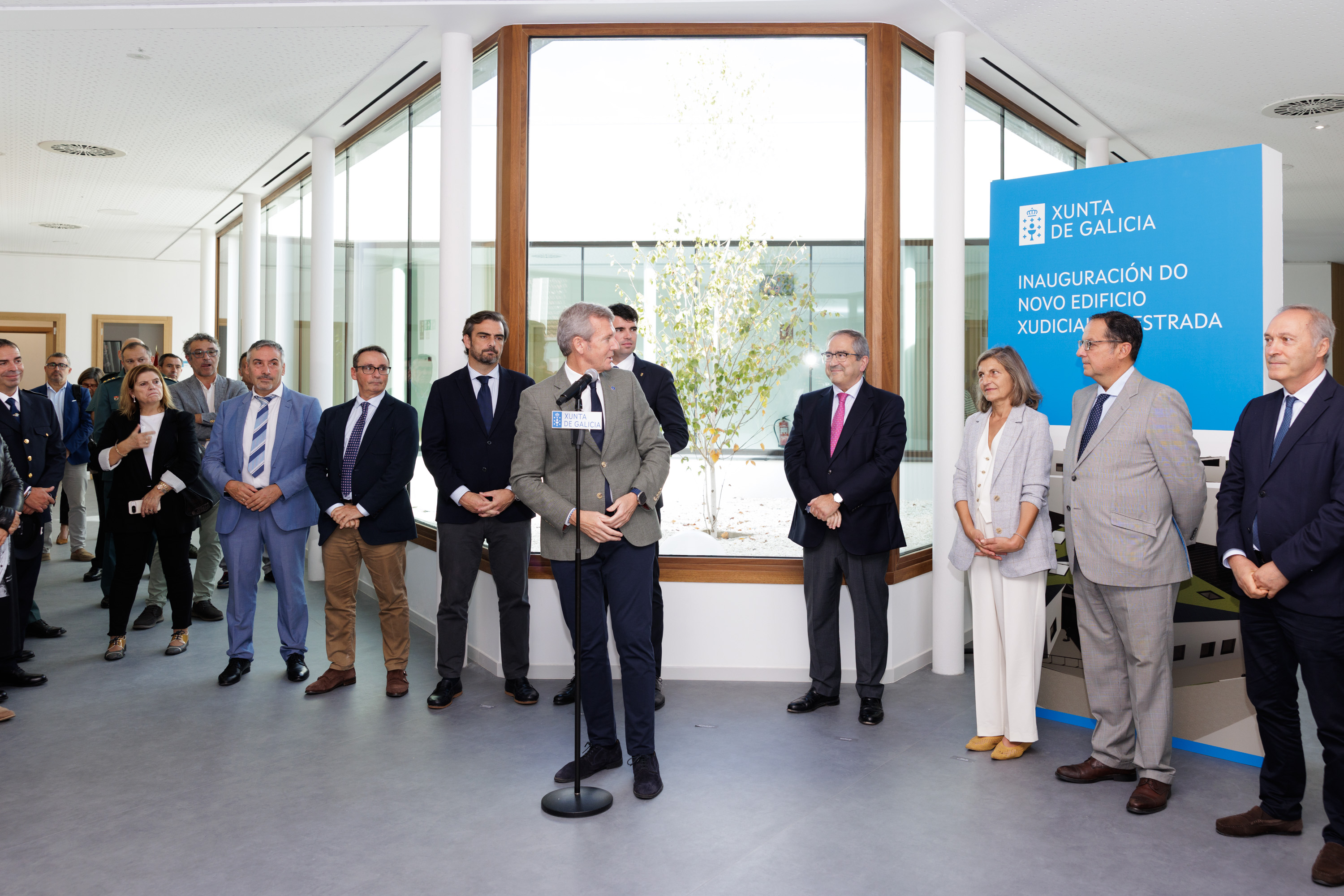 El presidente de la Xunta de Galicia, Alfonso Rueda, participó hoy en la inauguración oficial del nuevo edificio judicial de A Estrada, una infraestructura que culmina tras años de trabajo y que responde al compromiso del Gobierno gallego con la modernización de la Administración de la Justicia y con la mejora de los servicios públicos prestados a la ciudadanía. "Nuestro objetivo es habilitar edificios dignos para los que trabajan en ellos y los que vienen como administrados de la Justicia", indicó tras asegurar que el de A Estrada ?"es un edificio para el futuro que permitirá trabajar con comodidad, modernidad y transparencia".