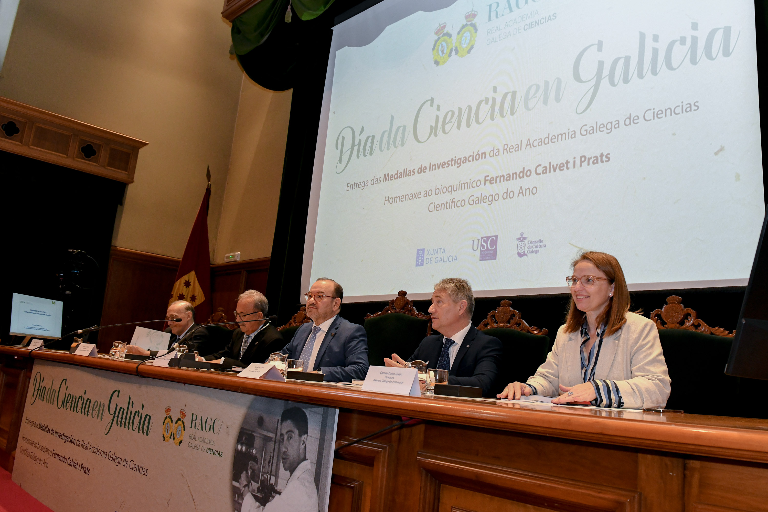 Además, también se realizó la entrega de la 7ª edición de las Medallas de Investigación. "La entrega de estas medallas y la recuperación de figuras de relieve como la de Fernando Calvet i Prats contribuye a difundir la ciencia excelente que se hace en Galicia y el potencial de la I+D+i con marca gallega, la I+G+i que impulsamos desde la Xunta", apuntó Carmen Cotelo.