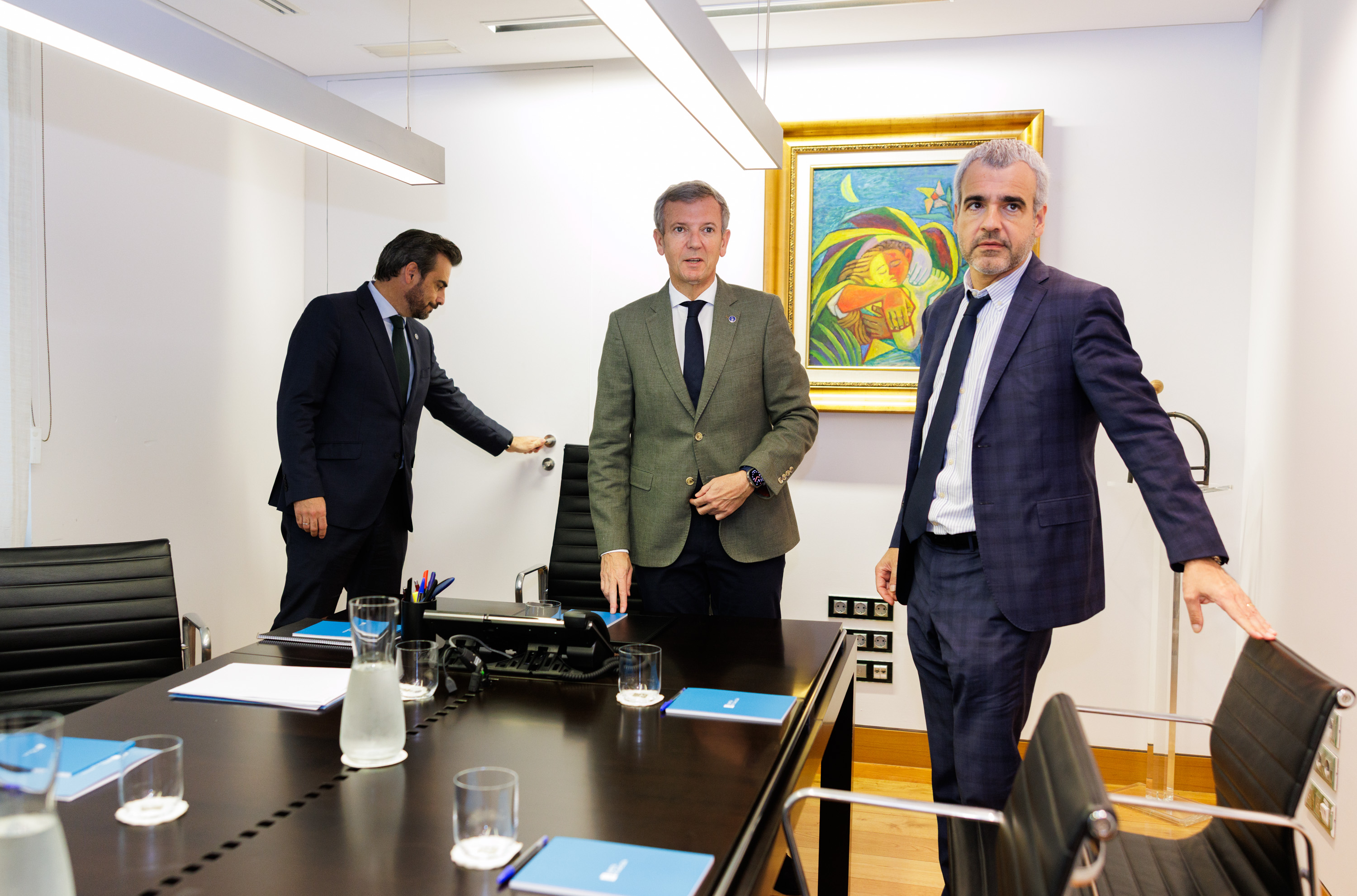 O presidente da Xunta de Galicia, Alfonso Rueda, acompañado do conselleiro de Presidencia, Xustiza e Deportes, Diego Calvo, reuniuse esta mañá co presidente de AENA, Maurici Lucena. Ao remate, Rueda salientou o encontro como unha “reunión frutífera, sobre todo como punto de partida de todo o que eu agardo que veña a partir de agora”.