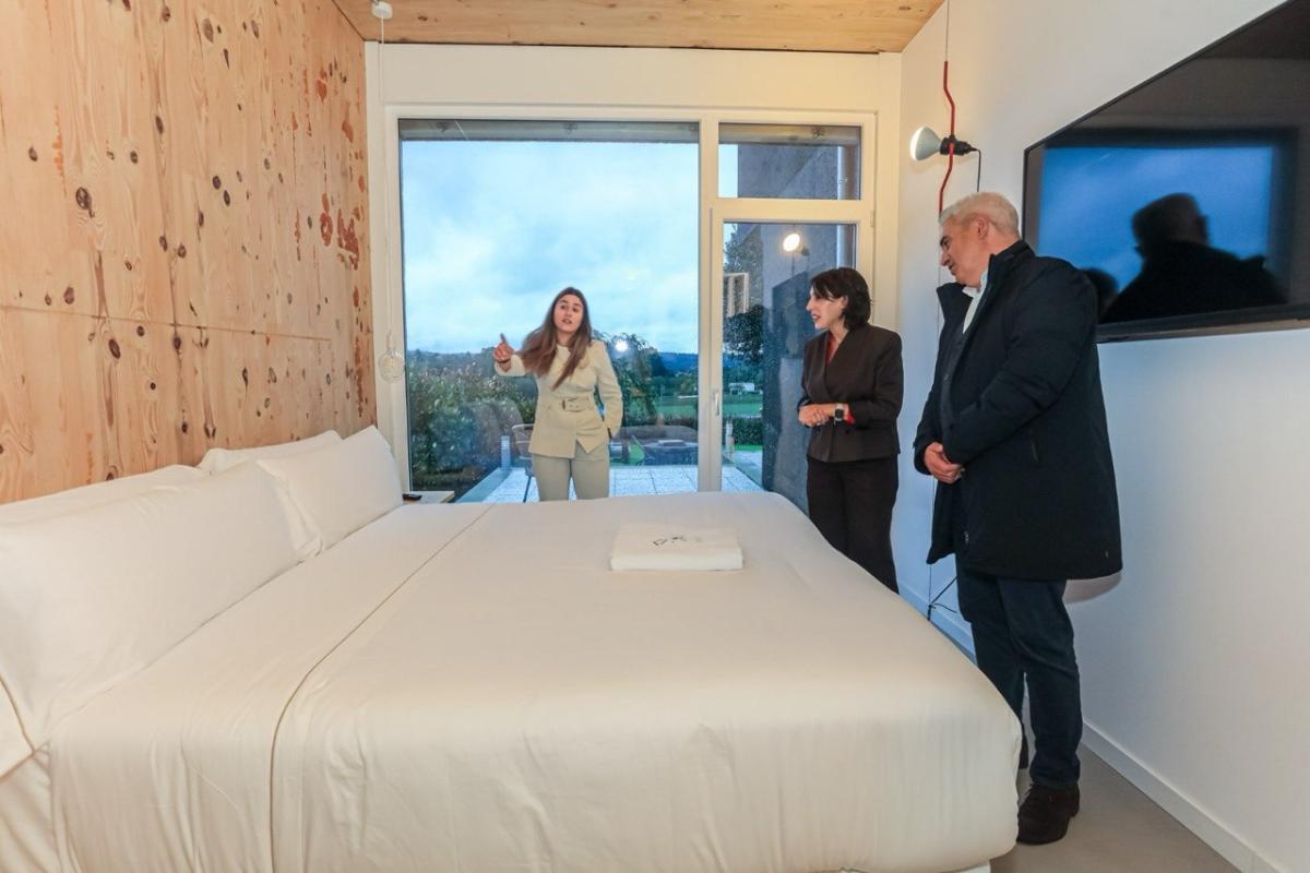 Lorenzana, acompañada del director de la Axencia Galega da Industria Forestal (Xera), Alfredo Fernández Ríos, visitó hoy en el ayuntamiento de O Pino (A Coruña) el hotel Amiuka, beneficiario de esta línea de apoyos, que utiliza madera de pino gallego en sus espacios interiores.