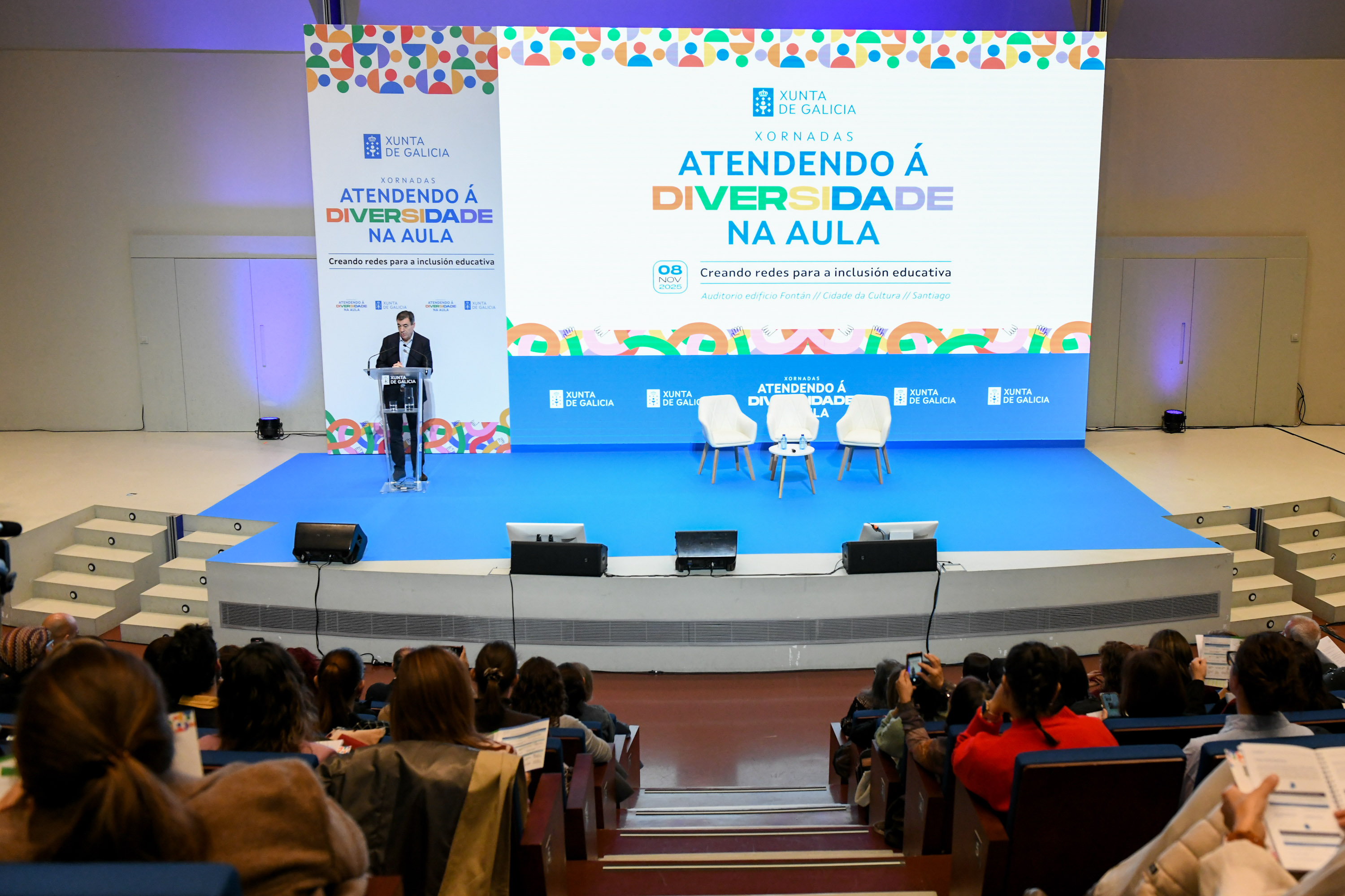 O conselleiro de Educación, Ciencia, Universidades e FP, Román Rodríguez, explicou hoxe que a Xunta vai investir máis de 28 M€ para desenvolver a Estratexia de Inclusión Educativa no ano 2026. Fíxoo co gallo das xornadas de formación docente Atendendo á diversidade na aula. Creando redes para a inclusión educativa, en cuxa inauguración participou esta mañá en Santiago.