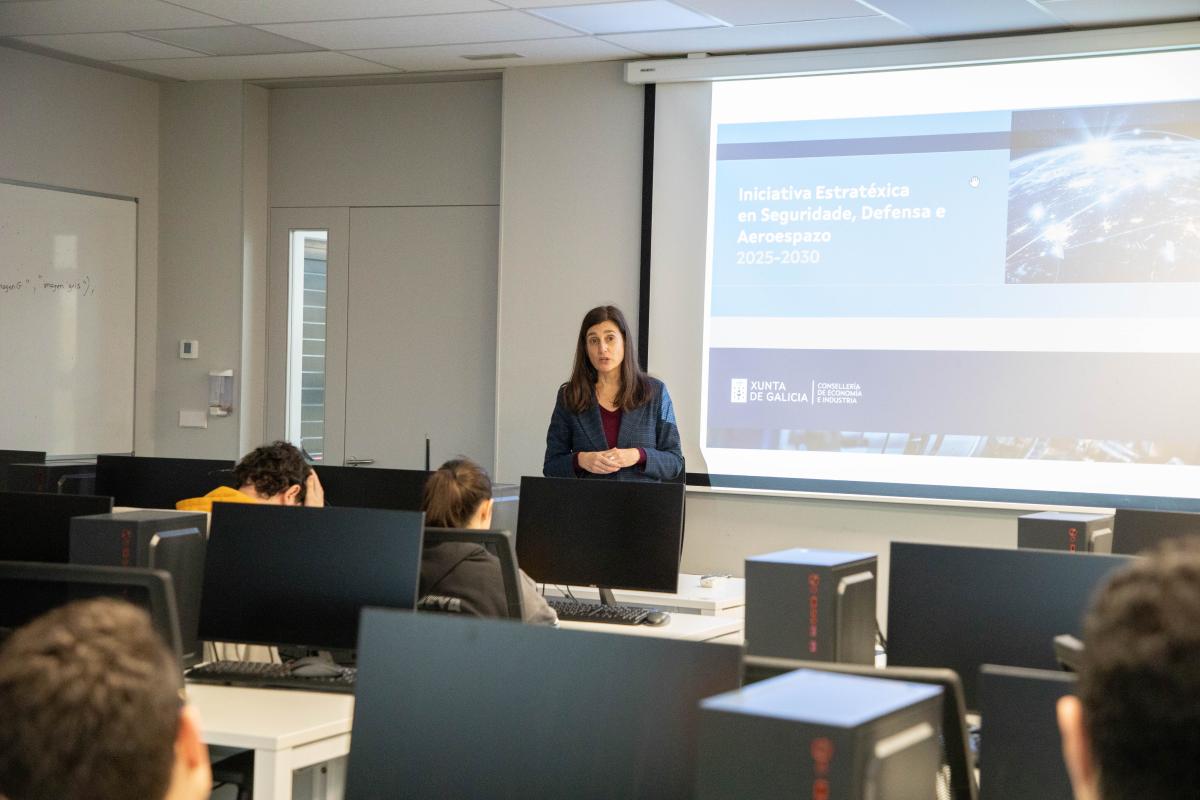 A directora xeral de Estratexia Industrial e Solo Empresarial, Margarita Ardao, presentou hoxe a Iniciativa Estratéxica en Seguridade, Defensa e Aeroespazo ao alumnado do mestrado en Enxeñaría Aeronáutica que se imparte na Escola de Enxeñaría Aeronáutica do Espazo do campus de Ourense da Universidade de Vigo, onde puxo en valor a formación especializada nestes sectores intensivos en tecnoloxía e subliñou as oportunidades de emprego cualificado e de calidade que ofrecen á mocidade galega.