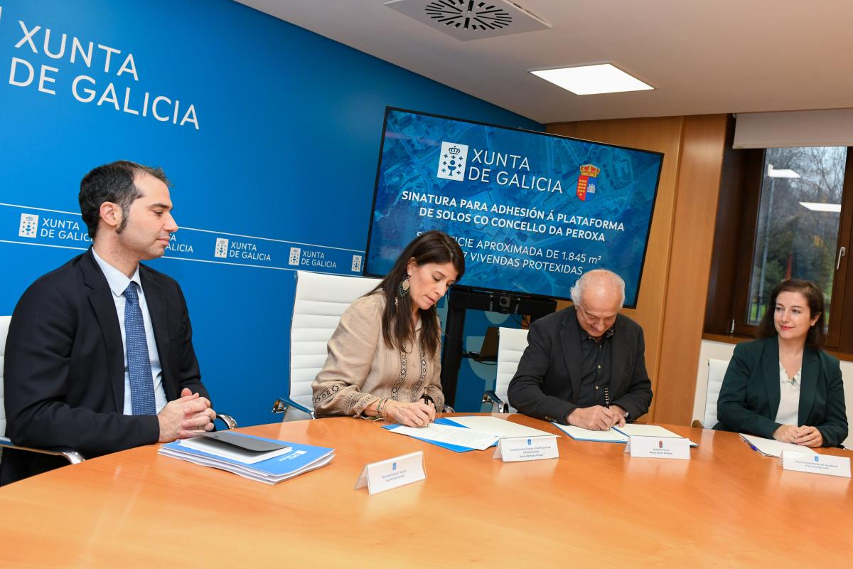 A conselleira de Vivenda e Planificación de Infraestruturas, María M. Allegue, xunto co secretario xeral técnico da Consellería, Yago Borrajo, vén de asinar co alcalde da Peroxa, Manuel Seoane Rodríguez, o convenio enmarcado no Programa de oferta de solo de titularidade das entidades locais para a construción de vivenda protexida neste municipio. Na sinatura do convenio tamén estivo a directora territorial da Consellería en Ourense, Pilar Fernández León.