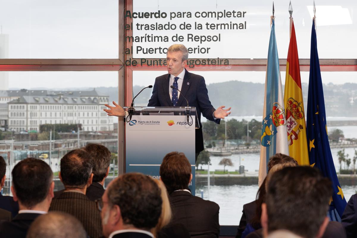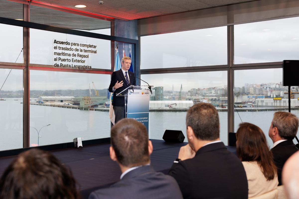 Así lo manifestó durante la presentación del acuerdo entre ambas entidades para completar el traslado desde el muelle de San Diego, que se completará en 2027. El titular del Gobierno gallego destacó este pacto como un gran hito que garantiza la continuidad del Complejo Industrial de Repsol en A Coruña y que consolidará al Puerto Exterior como un motor económico e industrial de primer nivel.