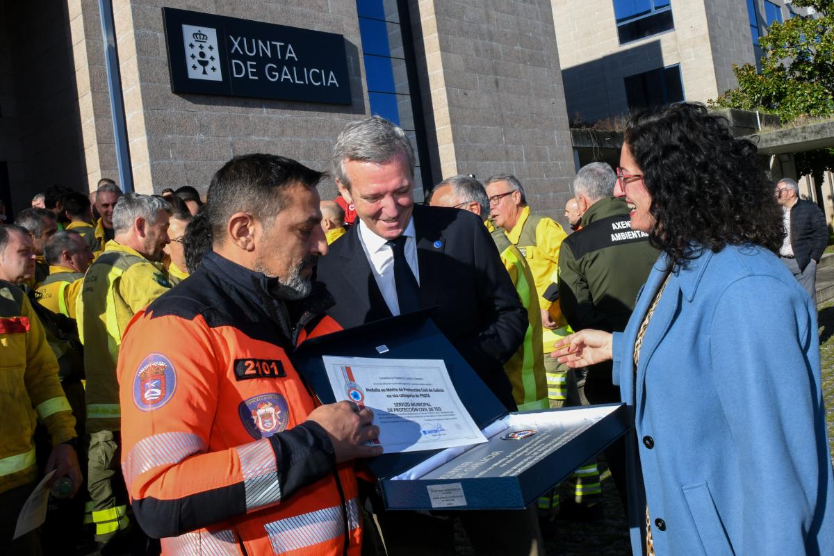 Así o salientou esta mañá na Estrada, no acto de entrega de medallas ao mérito de Protección Civil, no que estivo acompañado polo conselleiro de Presidencia, Xustiza e Deportes, Diego Calvo, e a conselleira do Medio Rural, María José Gómez. Un encontro onde o presidente do Executivo autonómico agradeceulles a todos os efectivos o seu traballo “en equipo”, especialmente en episodios recentes como a vaga de lumes do pasado verán ou a DINA de Valencia, pola cal se concederon 53 placas de prata tanto a voluntarios que quixeron axudar na traxedia como aos efectivos profesionais integrados no dispositivo coordinado pola Xunta. Neste sentido, o presidente agradeceu tamén “a todas as administracións galegas” aquel traballo coordinado “os días que foi preciso”, algo do que “todo o pobo galego sentiuse moi orgulloso”.