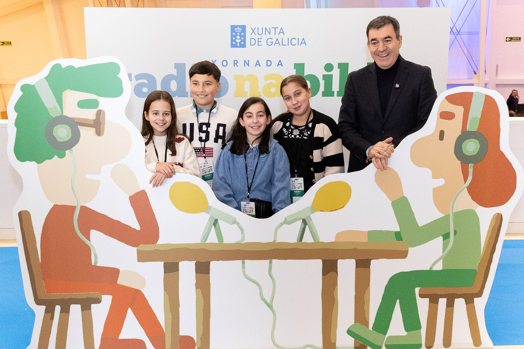 El conselleiro de Educación, Ciencia, Universidades e FP, Román Rodríguez, participó esta mañana en el primer encuentro de centros participantes en el programa Radio na biblio, impulsado por el departamento educativo de la Xunta de Galicia. La jornada reúne hoy en la Cidade da Cultura a 650 escolares de 5º y 6º de Primaria y a docentes que participan en las emisoras de sus respectivos centros. El objetivo es poner en valor el trabajo del alumnado y del profesorado en este ámbito y destacar el papel de la radio como herramienta formativa.