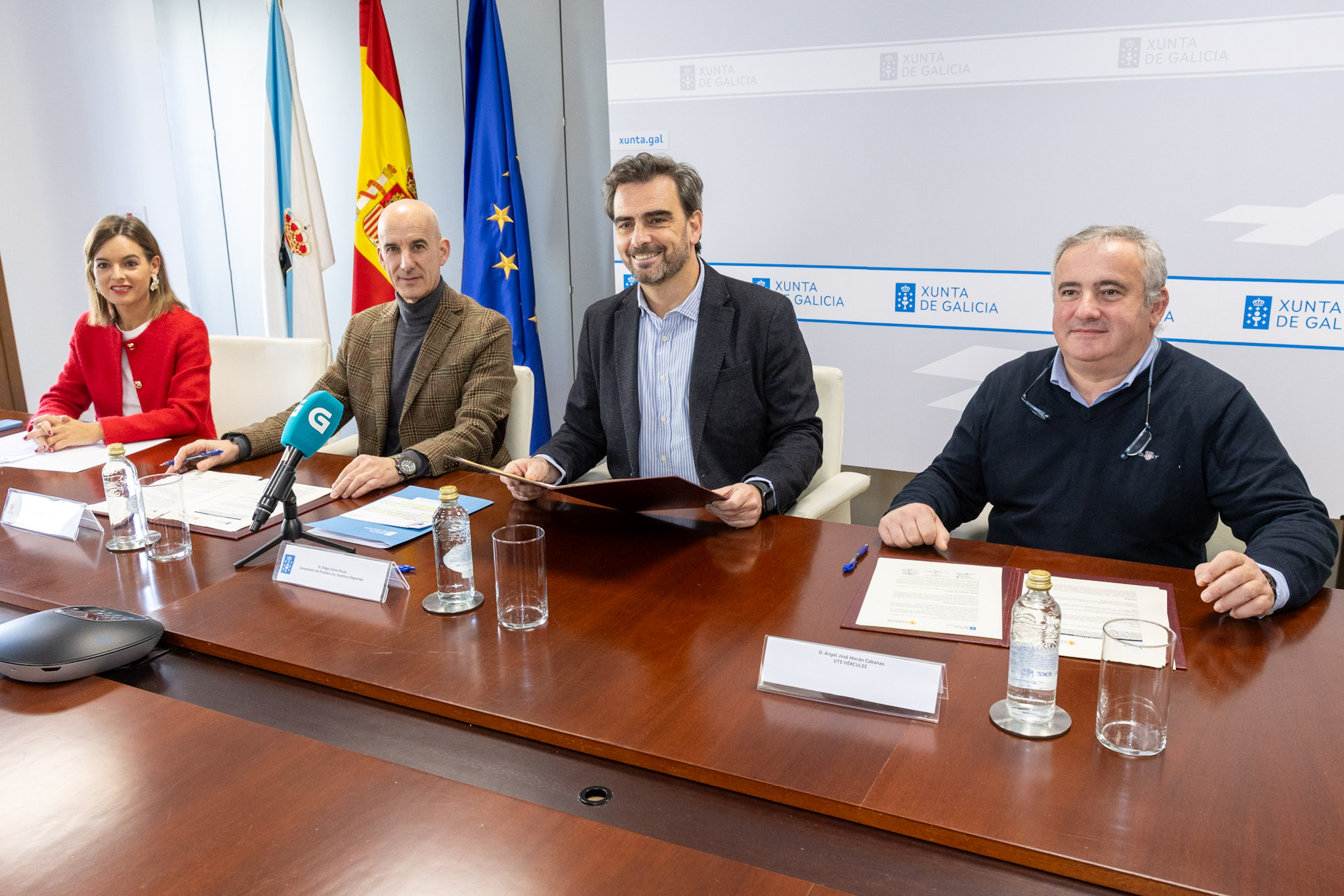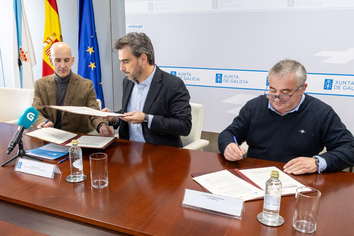 El conselleiro de Presidencia, Xustiza e Deportes, Diego Calvo, y el alcalde de Curtis, Javier Caínzos, formalizaron hoy con la UTE Hércules el convenio de colaboración para impulsar la creación de un servicio de interés municipal (SIMU) que ampliará la oferta de transporte público en esta localidad. También estuvo presente la directora general de Movilidad, Judit Fontela.