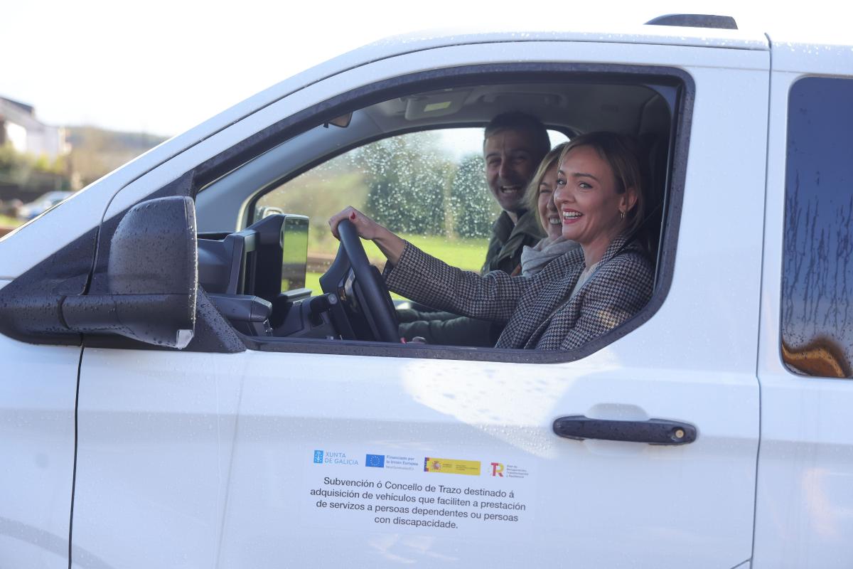 La conselleira de Política Social e Igualdade, Fabiola García, acompañada de la alcaldesa de Trazo, Josefina Suárez, y de la directora general de Personas con Discapacidad, Begoña Abeijón, presentó esta mañana el nuevo vehículo de transporte adaptado con el que contará el municipio gracias a una aportación de la Xunta de Galicia de 50.000 €.