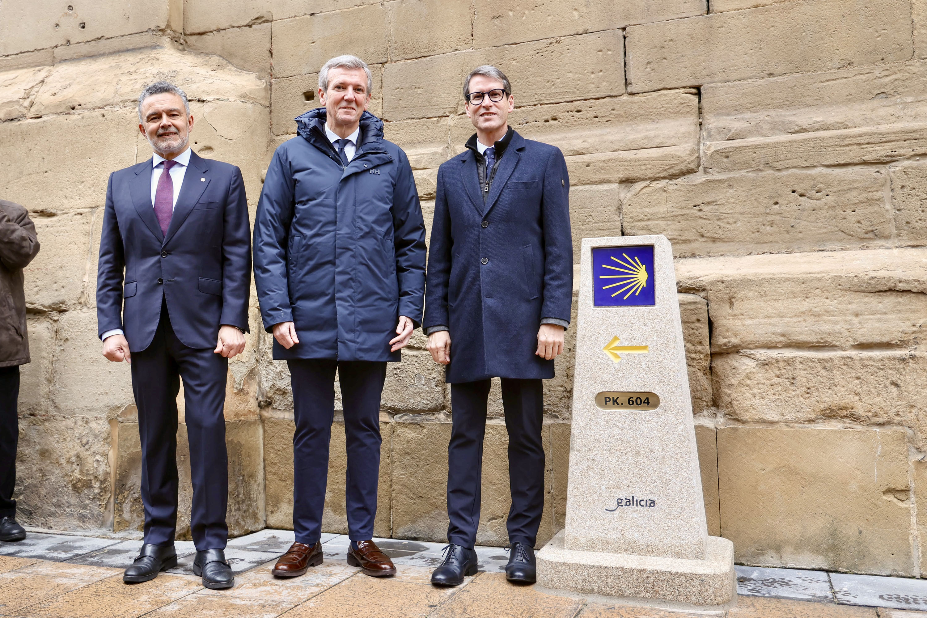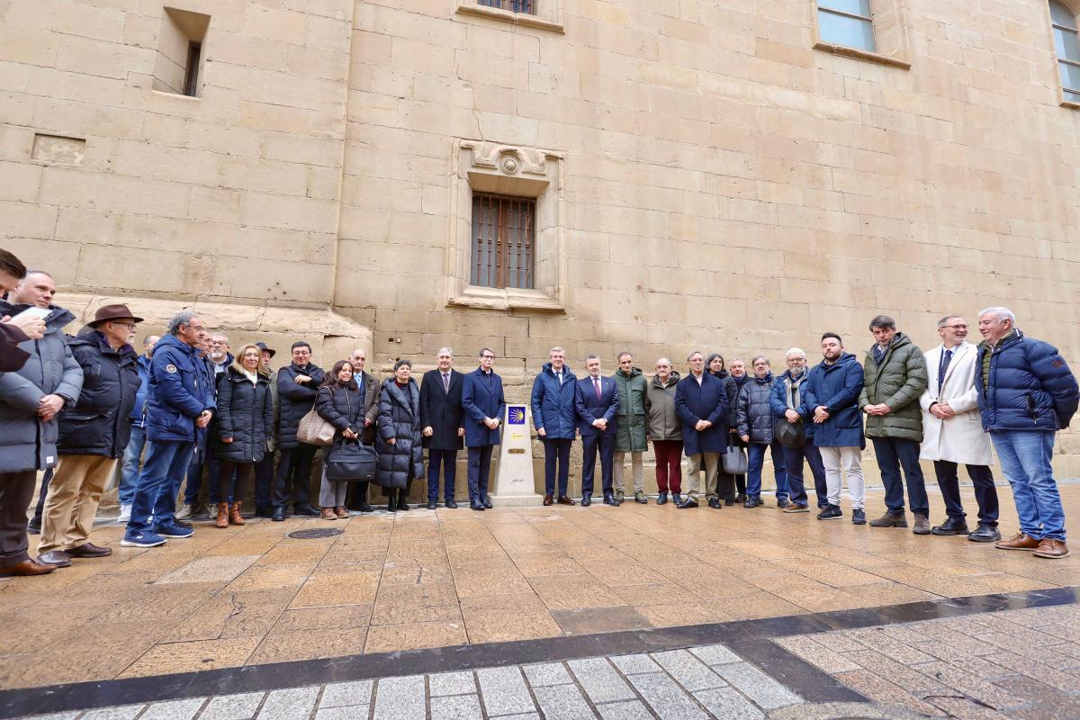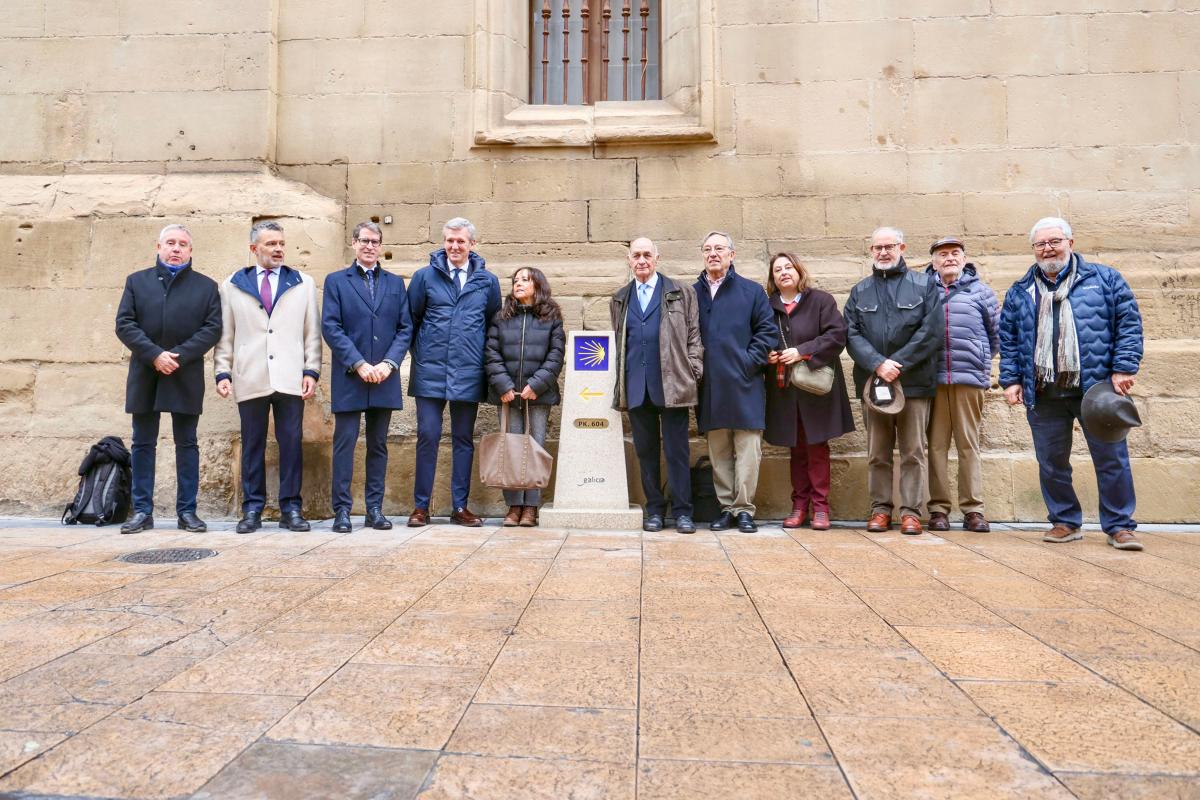 Alfonso Rueda aproveitou a súa viaxe á capital rioxana para participar na inauguración dunha nova mouteira do Camiño de Santiago nas inmediacións da Concatedral de Santa María La Redonda, co fin de seguir promovendo e divulgando a ruta xacobea.