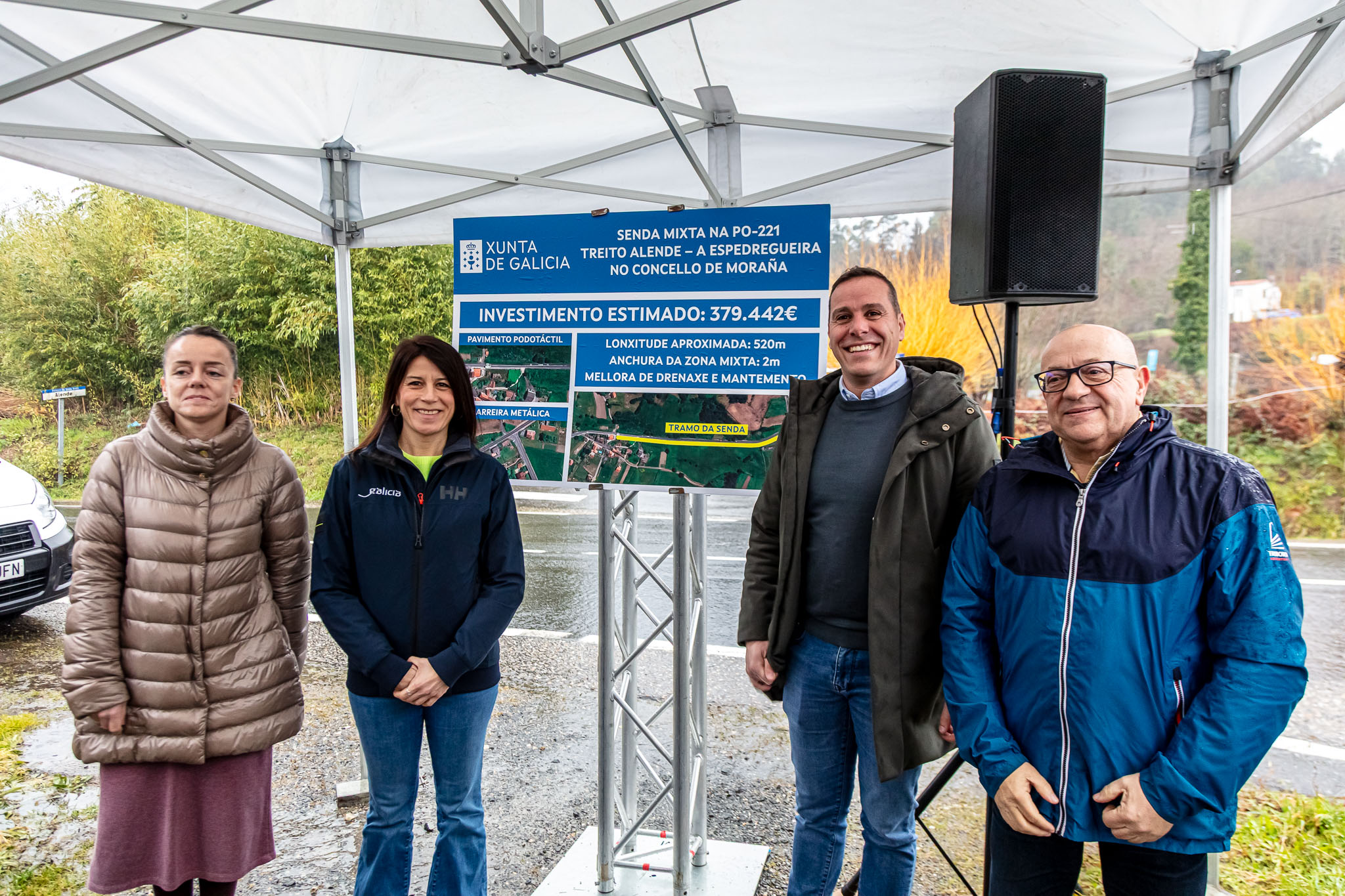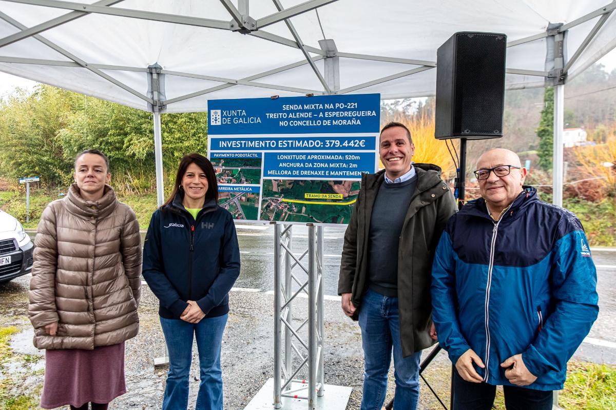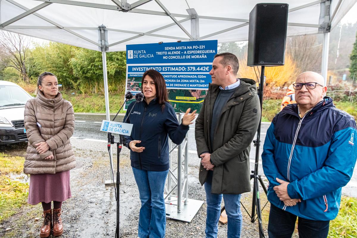 A conselleira de Vivenda e Planificación de Infraestruturas, María M. Allegue, xunto á directora da Axencia Galega de Infraestruturas, María Deza, presentou hoxe en Moraña a nova senda peonil e ciclista na PO-221, que terá un investimento da Xunta por preto de 380.000€. Este itinerario de algo máis de medio quilómetro discorrerá entre os núcleos de Alende e A Espedregueira.