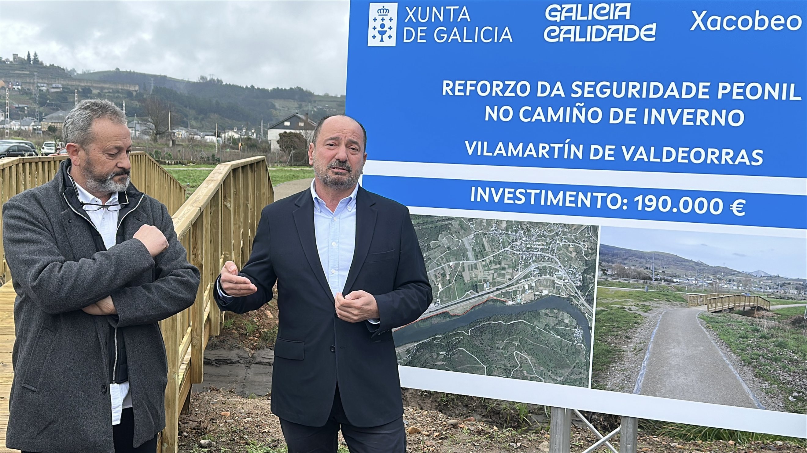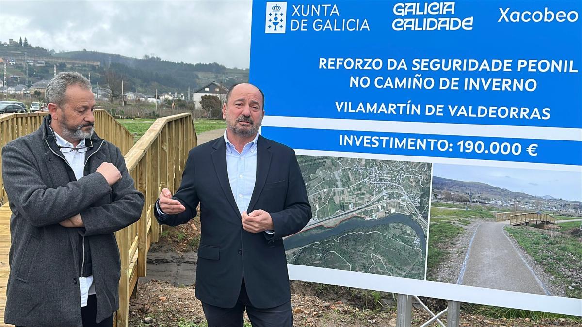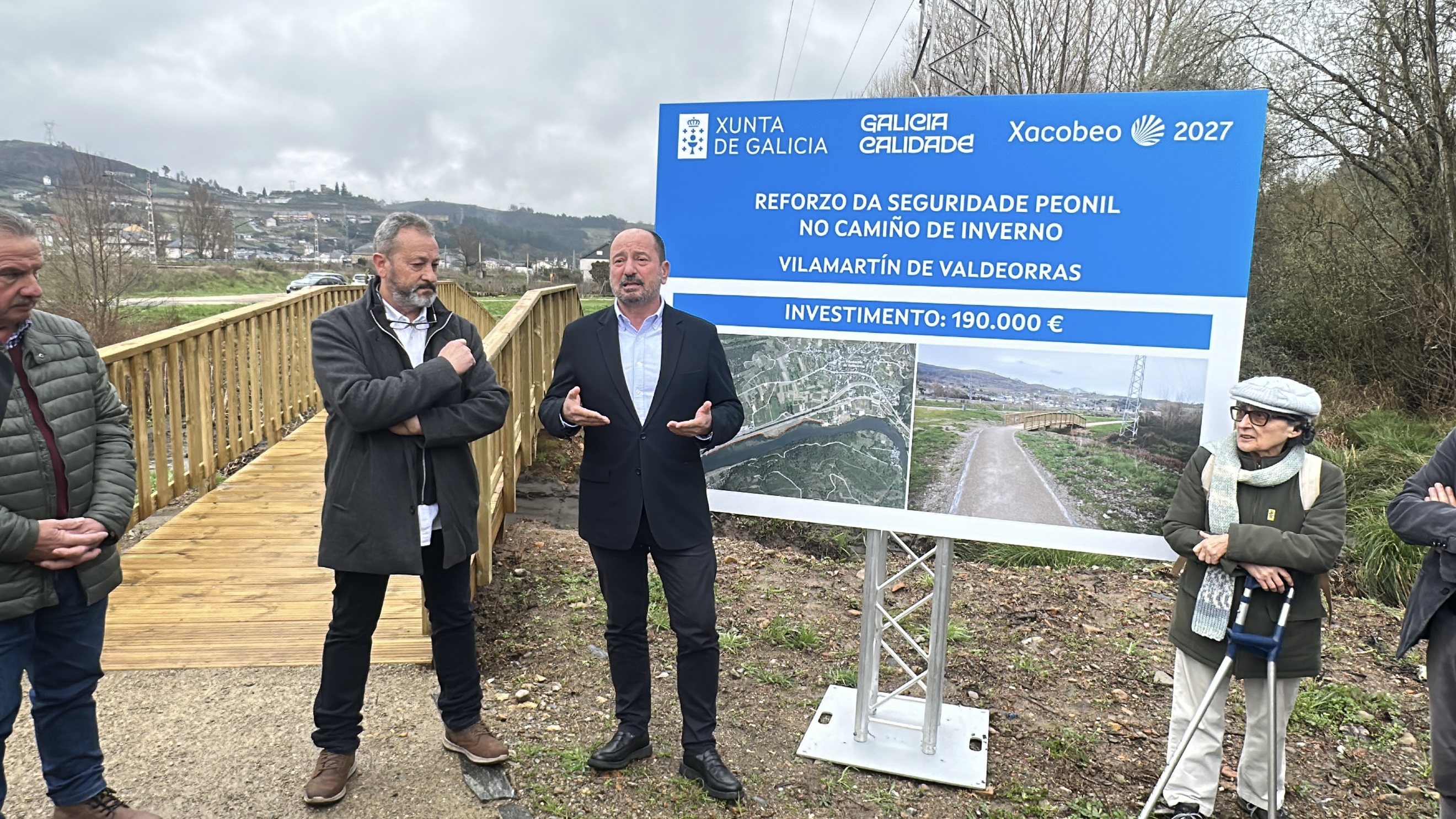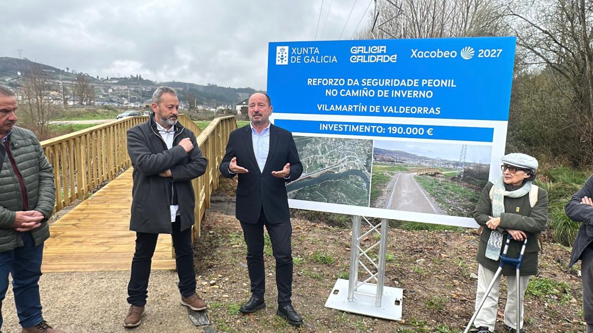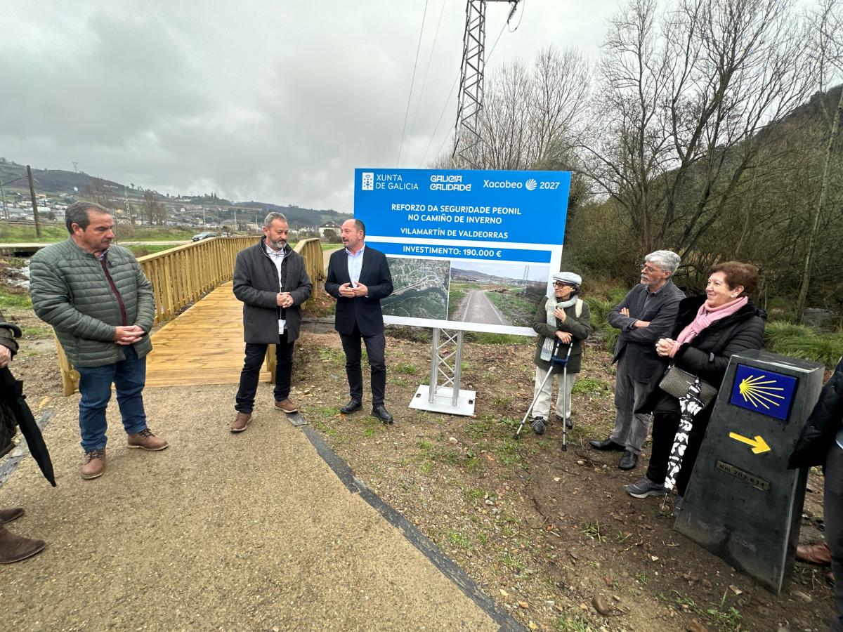 O director de Turismo de Galicia, Xosé Merelles, acompañado polo director de administración e relación coas asociacións do Amigos do Camiño de Santiago, Ildefonso de la Campa, inaugurou esta mañá en Vilamartín de Valdeorras a nova senda do Camiño de Inverno que discorre ao longo de 1,3 km mellorando a seguridade dos peregrinos cunha pasarela que os afasta da vía do tren e tamén da Estrada local. Turismo de Galicia investiu nesta actuación 190.000 euros.