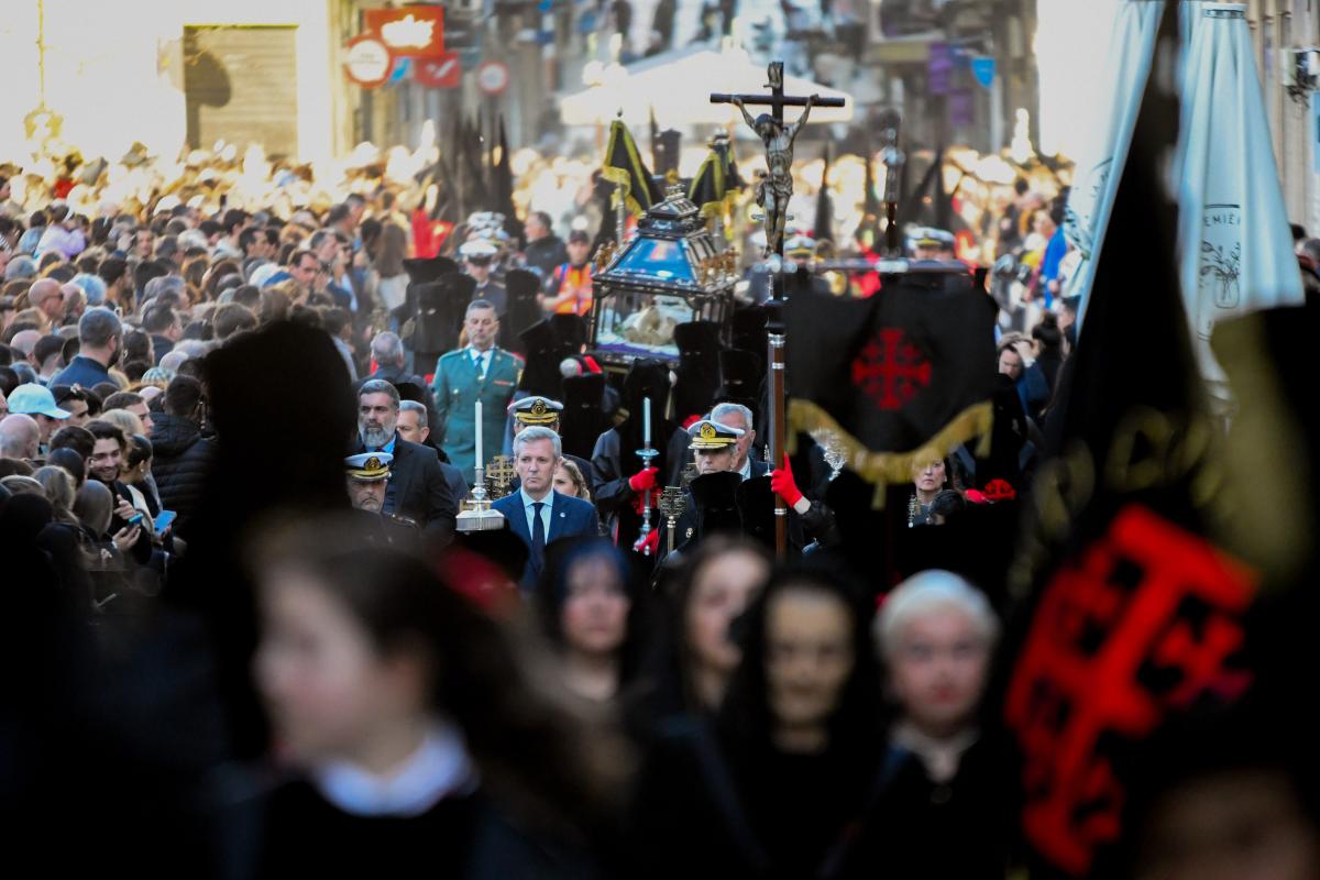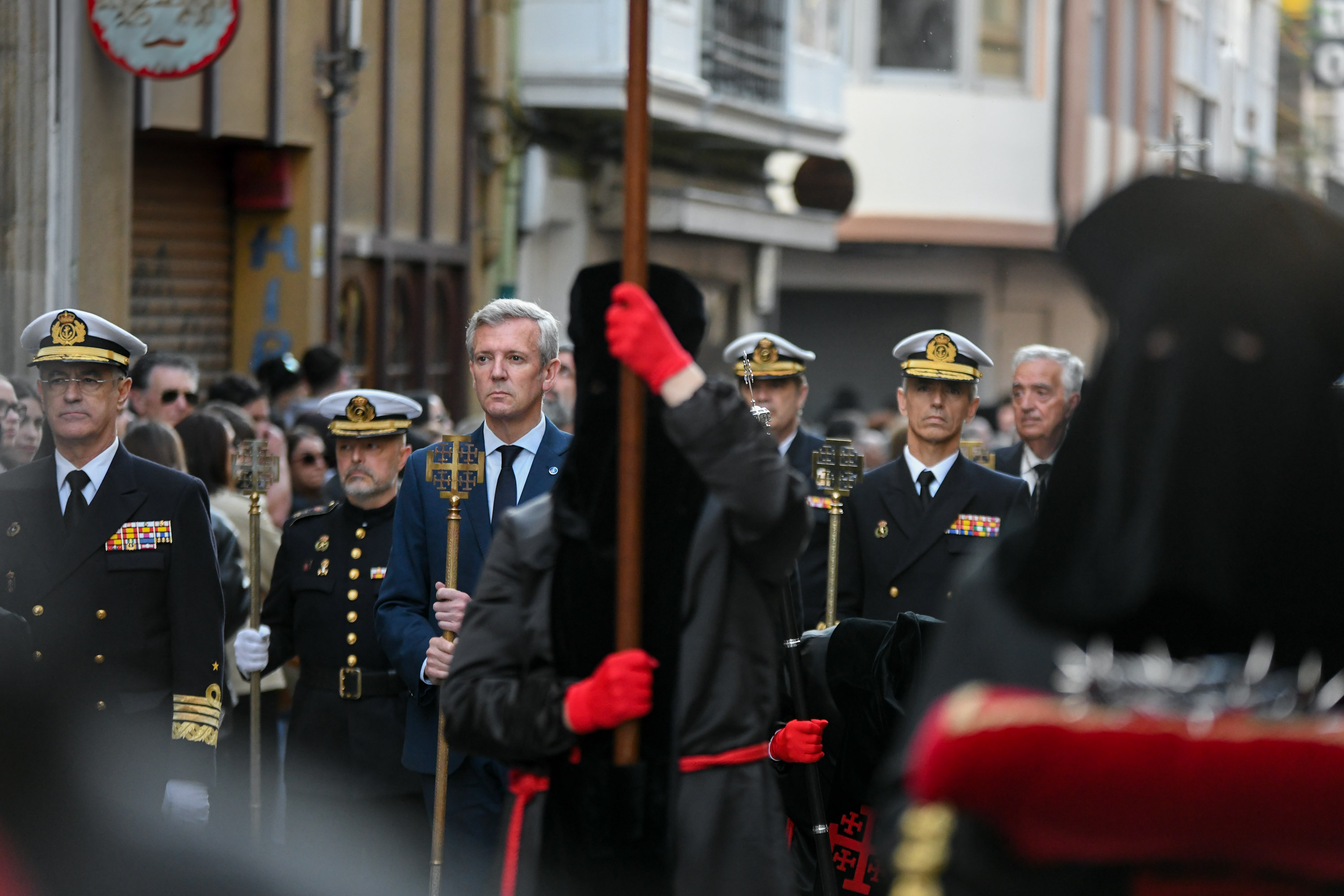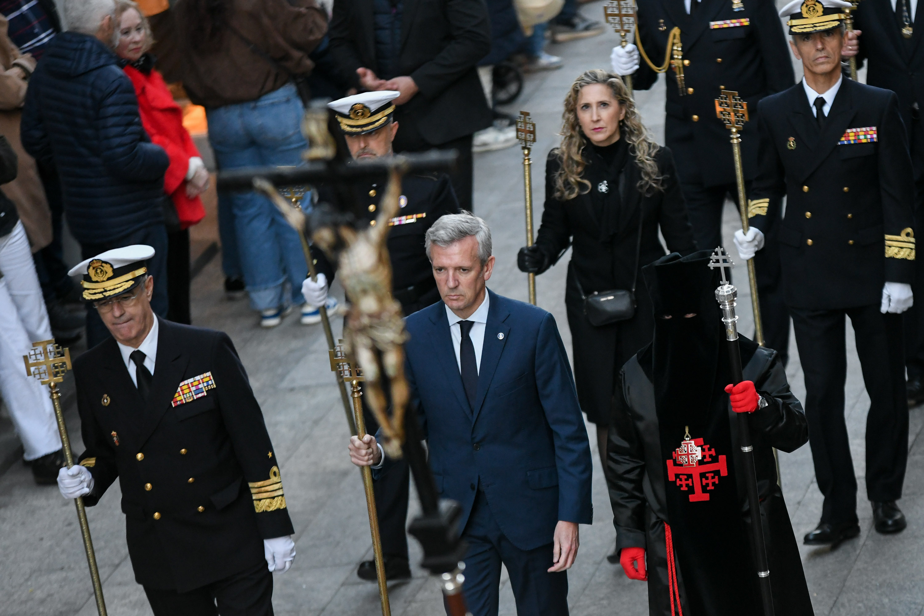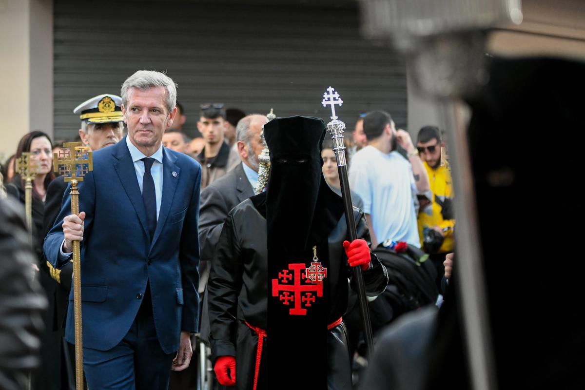 O presidente da Xunta, Alfonso Rueda, acompañado polo conselleiro de Presidencia, Xustiza e Deportes, Diego Calvo, participou na procesión do Santo Enterro.