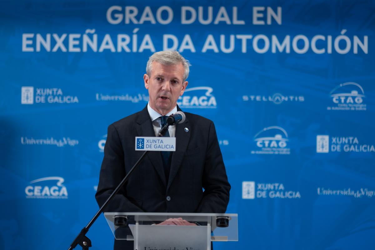 O presidente da Xunta, Alfonso Rueda, aposta por impulsar a implantación de graos duais nas universidades que combinen formación e contrato laboral regrado. O titular do Goberno galego defendeuno na sinatura dun convenio para impulsar o grao de Enxeñaría da automoción dual da Universidade de Vigo, un acto no que participou o conselleiro de Cultura, Educación, Formación Profesional e Universidades, Román Rodríguez.