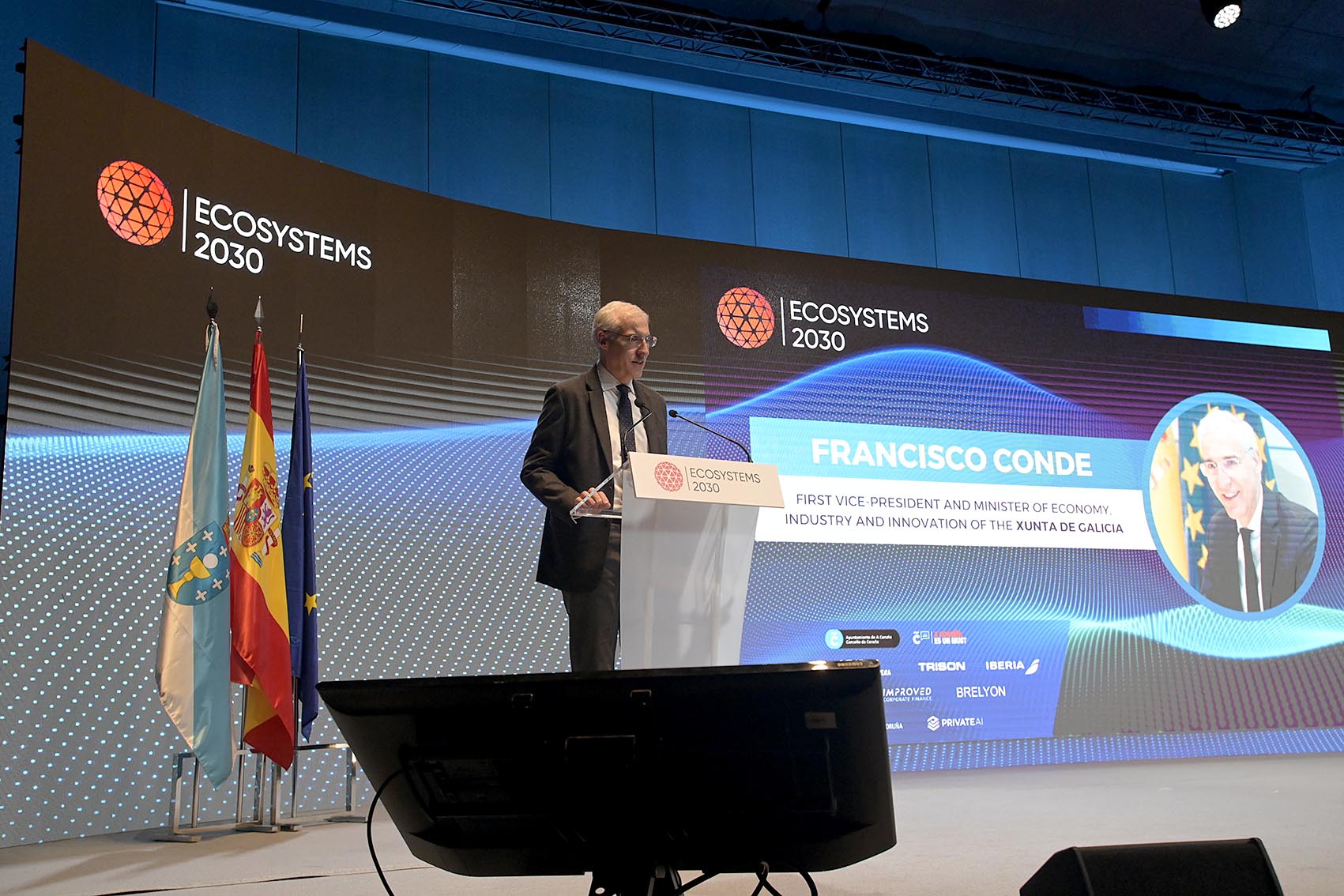 O vicepresidente económico e conselleiro de Economía, Industria e Innovación, Francisco Conde, que interveu na Coruña na apertura de Ecosystems 2030, pon como exemplos a Axencia Española de Intelixencia Artificial, o Polo Cuántico e a Cidade das TIC