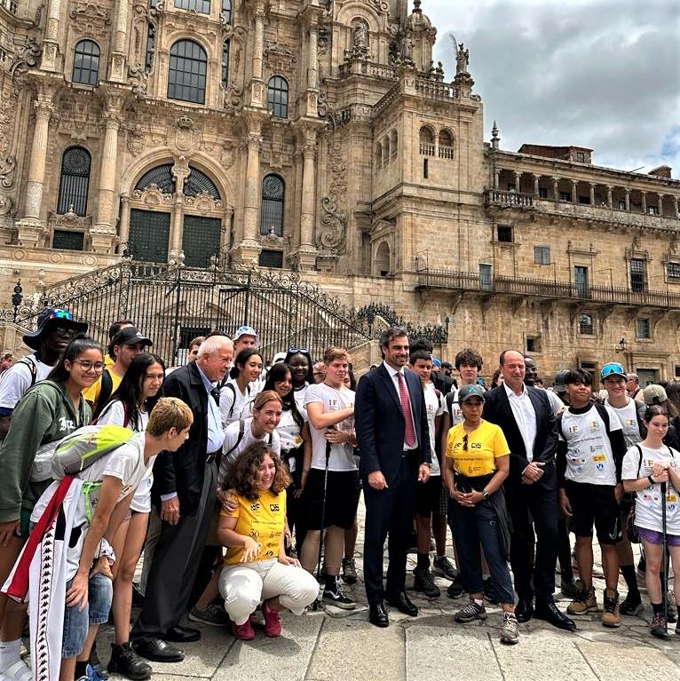 Santiago de Compostela, 04 de julio de 2023 El vicepresidente primero y conselleiro de Presidencia, Xustiza e Deportes, Diego Calvo, y el director de la Axencia de Turismo de Galicia, Xosé Manuel Merelles, recibieron hoy en la plaza del Obradoiro a un grupo de chicos y chicas participantes en el programa “Camiñlo de Santiago” de la fundación International Studies Foundation encabezados por la embajadora de Estados Unidos en España, Julissa Reynoso, junto con la comisionada de Miami Dade Distrito 7, Raquel Regalado.