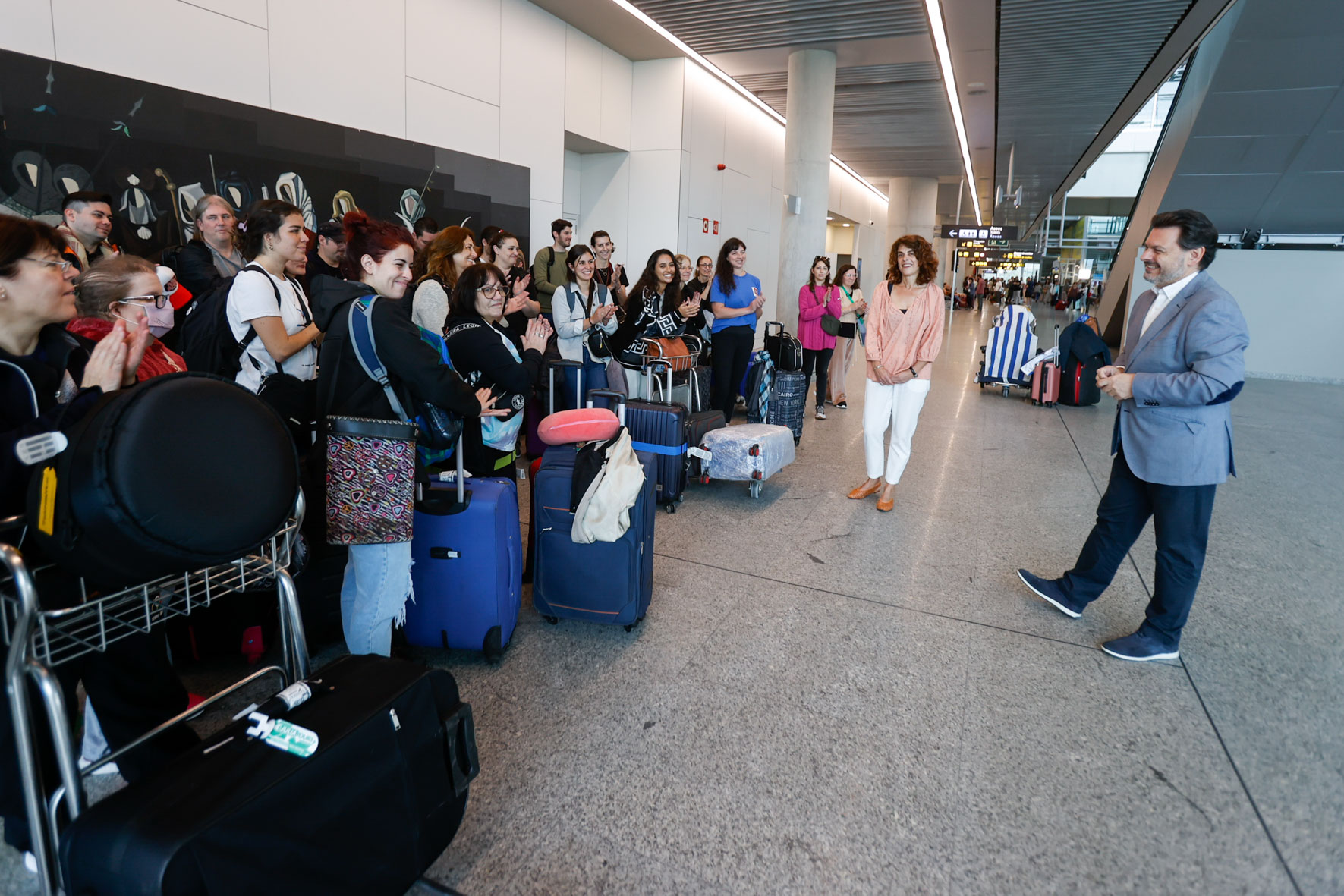 O secretario xeral da Emigración, Antonio Rodríguez Miranda, recibiu esta mañá no aeroporto de Santiago de Compostela-Rosalía de Castro aos participantes do programa Escolas Abertas que se volve a desenvolver tras tres anos de suspensión por mor da pandemia.