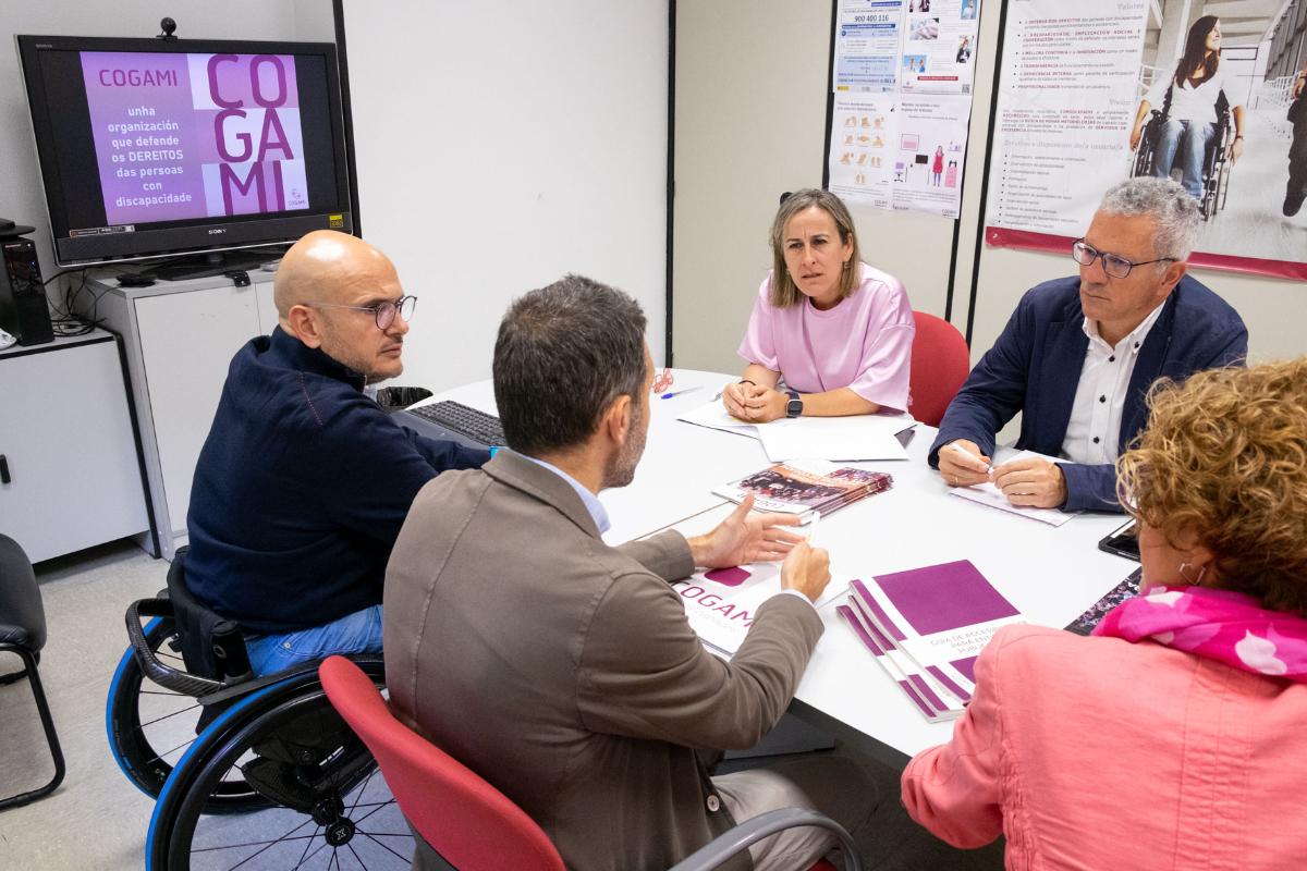 A conselleira de Infraestruturas e Mobilidade, Ethel Vázquez, xunto co director xeral de Mobilidade, Ignacio Maestro, visitou esta mañá as instalacións da sede central que COGAMI ten en Santiago de Compostela, onde mantivo un encontro de traballo co presidente da entidade, Anxo Queiruga, co secretario xeral, Víctor Silva, e coa coordinadora de Áreas, María Rosario Lema, no que lle trasladou todos os detalles desta iniciativa pioneira da Xunta.