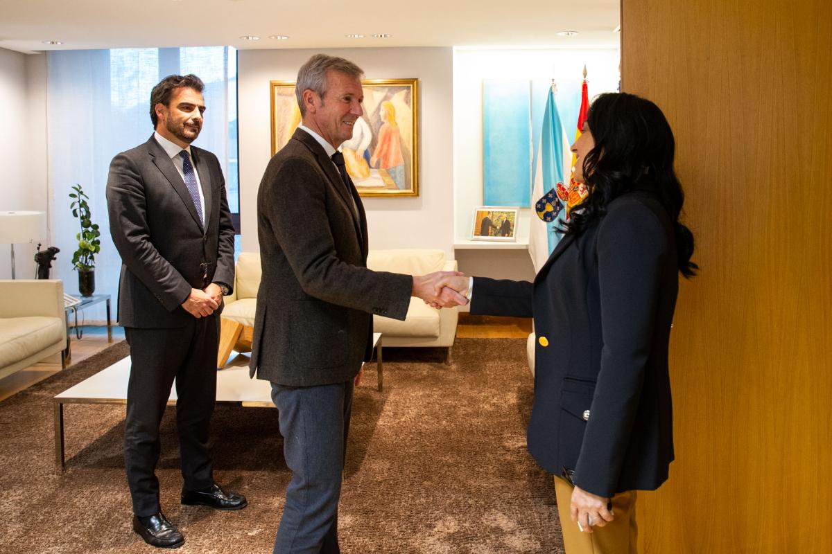 Durante a reunión, o titular do Goberno galego -acompañado polo vicepresidente primeiro e conselleiro de Presidencia, Xustiza e Deportes, Diego Calvo- e a embaixadora turca avaliaron as oportunidades que ofrece Turquía para o sector pesqueiro galego e a industria vencellada.