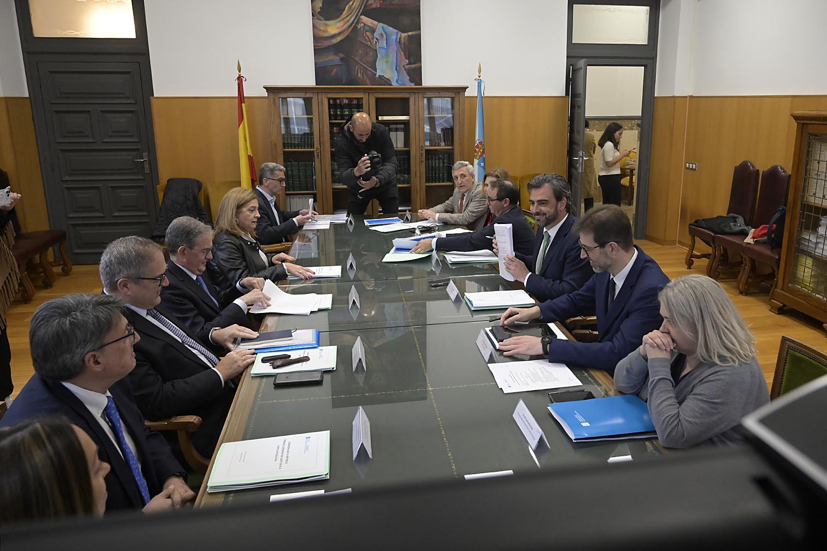 El conselleiro de Presidencia, Xustiza e Deportes, Diego Calvo, y el presidente del Tribunal Superior de Xustiza de Galicia, José María Gómez y Díaz-Castroverde, presidieron esta mañana la reunión para pedirle al Gobierno central más unidades judiciales y magistrados para Galicia